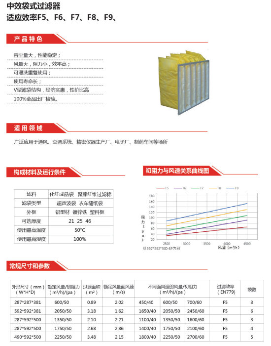 結構緊湊,輕便 中效袋式過濾器的框架可選用鍍鋅鋼、鋁合金,再輔以濾袋支撐鐵骨架,既有效支撐了濾袋,又可最大限度的增加過濾面積,整體緊湊,堅固,易于安裝、拆卸。 優(yōu)質的多層聚酯濾料,高容塵,低阻力 采用優(yōu)質蓬松的多層聚酯合成纖維,其進風面蓬松, 出風面緊實,在保證效率的同時,提供了較大的容塵量。 合理的設置了濾袋數(shù)量,增加了過濾面積及容塵量,同時降低了阻力。