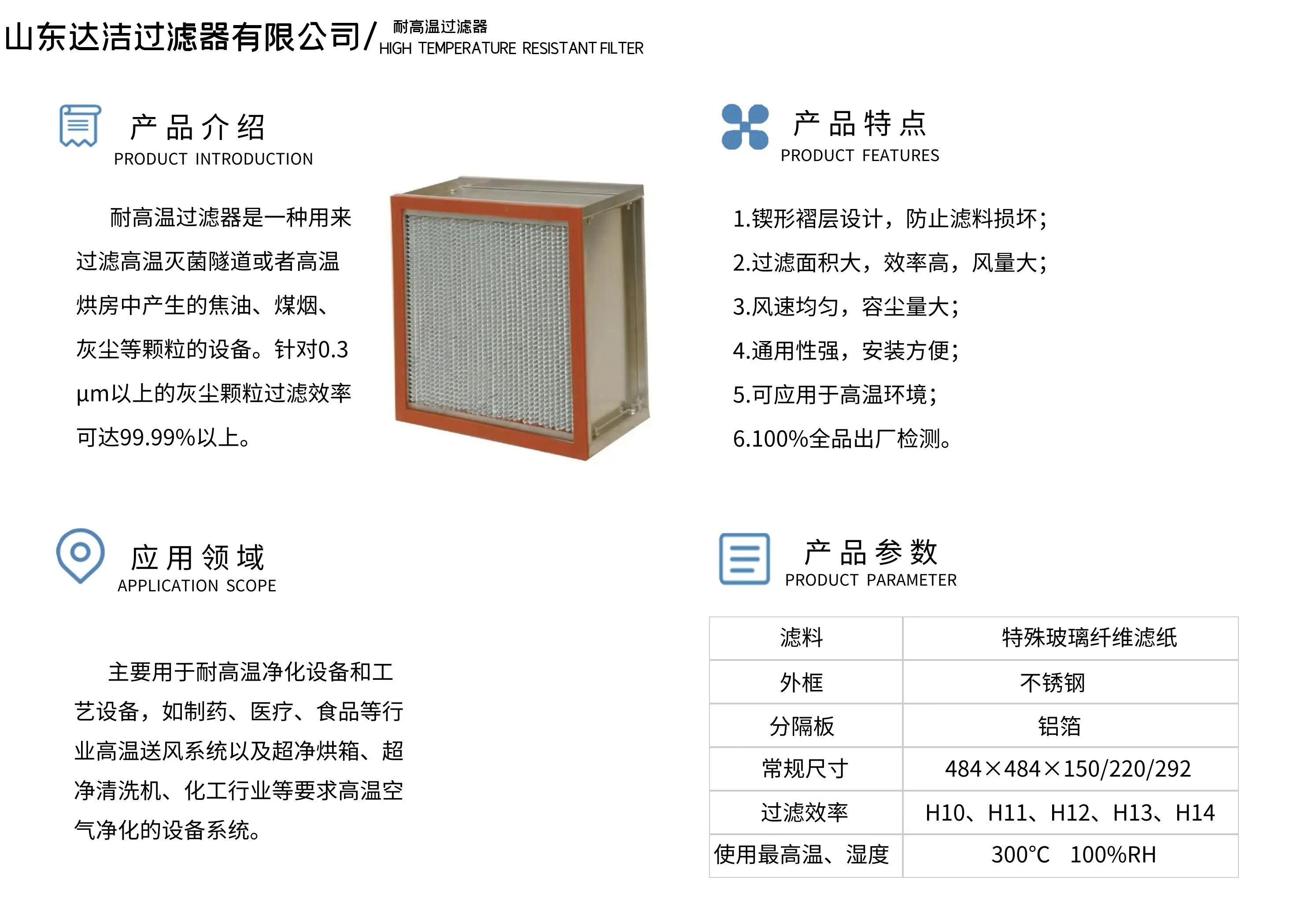 耐高溫過濾器是一種用來過濾高溫滅菌隧道或者高溫烘房中產(chǎn)生的焦油、煤煙、灰塵等顆粒的設備。針對0.3um以上的灰塵顆粒過濾效率可達 99.99%以上